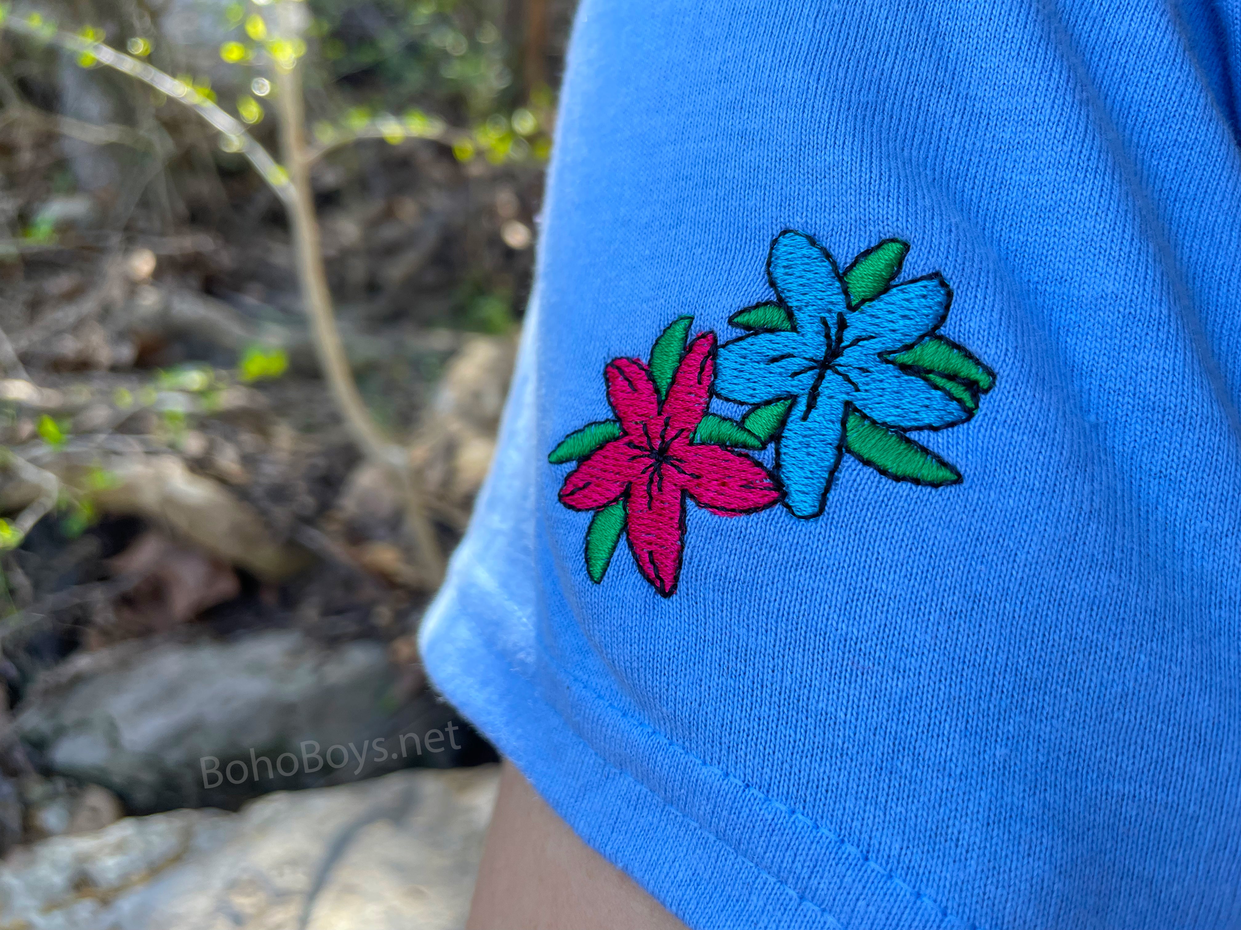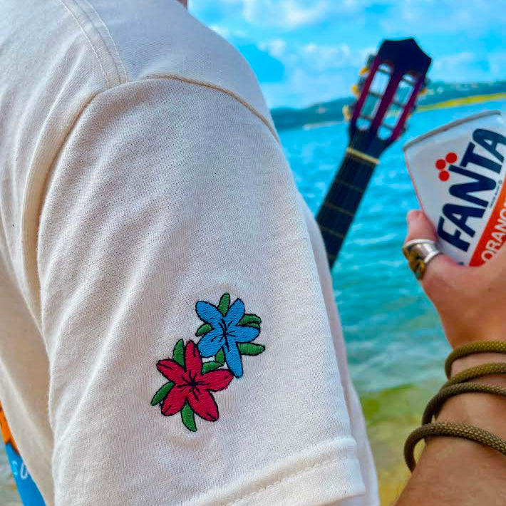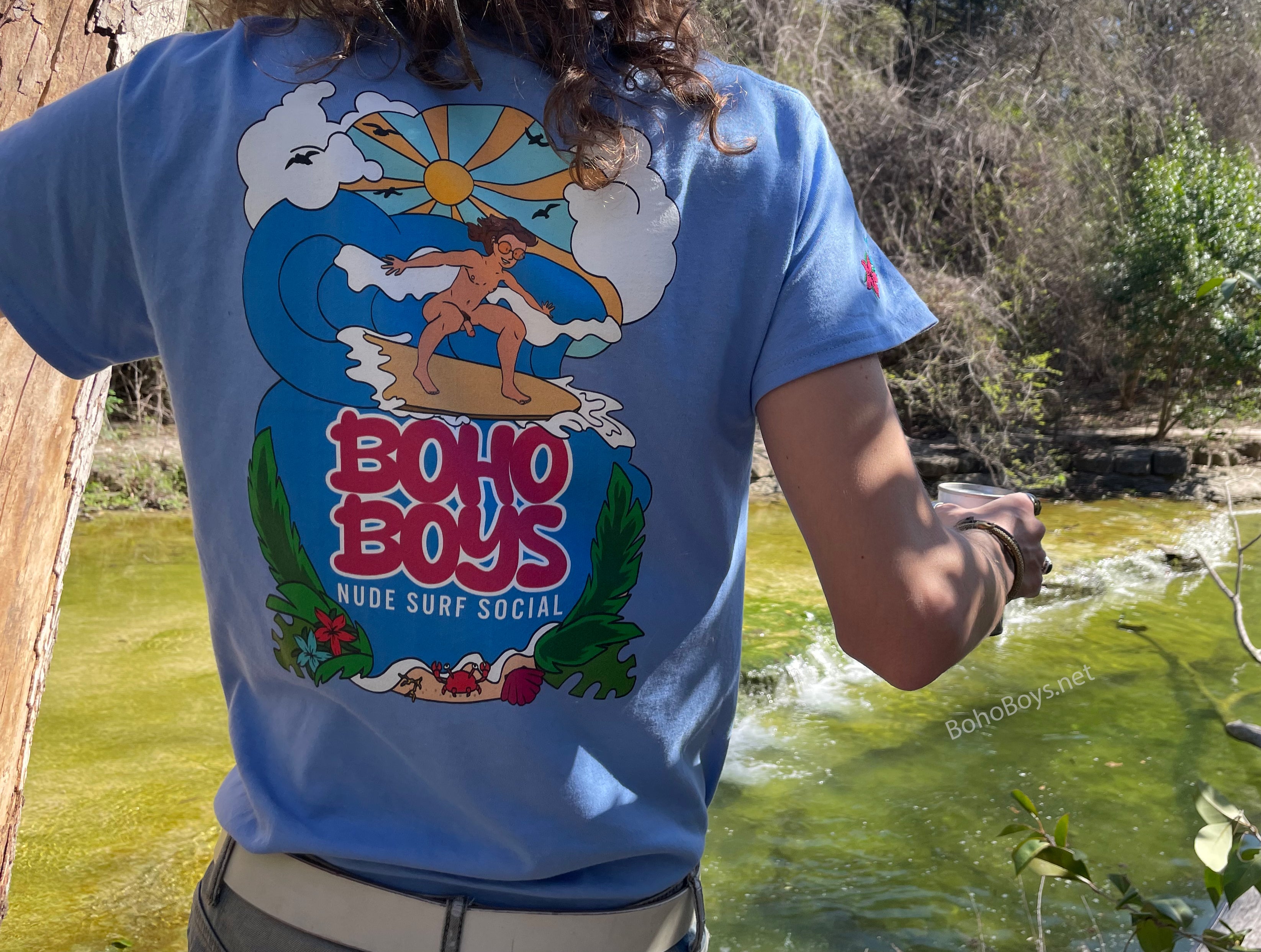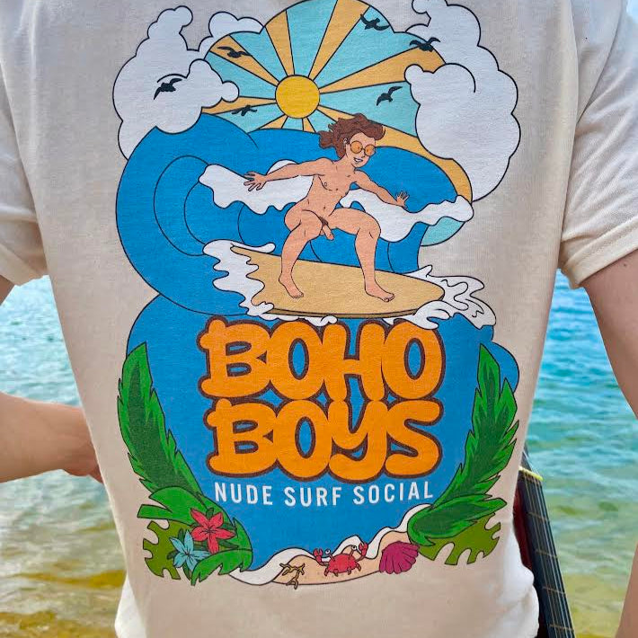 Ride the waves in true Boho Boys® style with the Nude Surf Social Tee, blending bold embroidery, vintage surf energy, and effortless queer confidence. Featuring the "Surf Nude" embroidery on the front, this tee keeps it sleek up front while bringing free-spirited beach vibes to life. The right sleeve is embroidered with red and blue floral detailing, adding the perfect touch of retro charm.