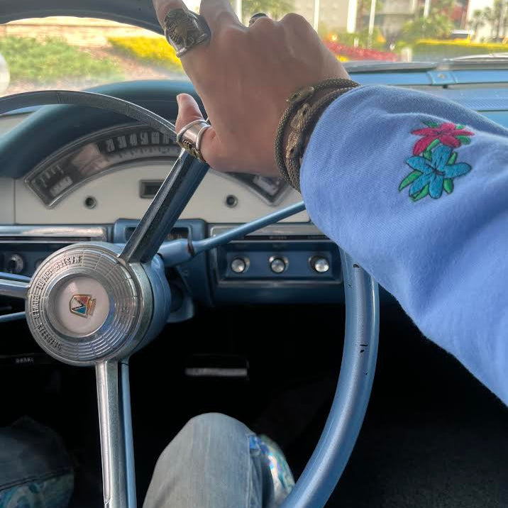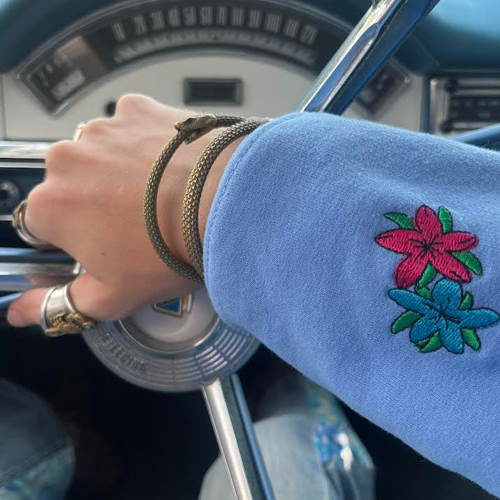 From boardwalk struts to nightclub lights, the Boho Boys® Blue Zip-Up Hoodie is made to ride the rhythm of queer summer. Featuring bold red and blue floral embroidery that echoes the back print—where our iconic nude surfer in orange Lennon glasses catches a wave—it’s equal parts laid-back and legendary.