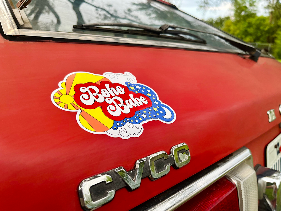 First Edition — Boho Babe® Sun & Moon Sticker, a dreamy blend of celestial vibes and retro charm. This high-quality vinyl sticker features the iconic Boho Boys® Sun & Moon design, now with a Boho Babe® twist— perfect for adding a touch of cosmic energy to your laptop, water bottle, surfboard, or anywhere you want to leave your mark.